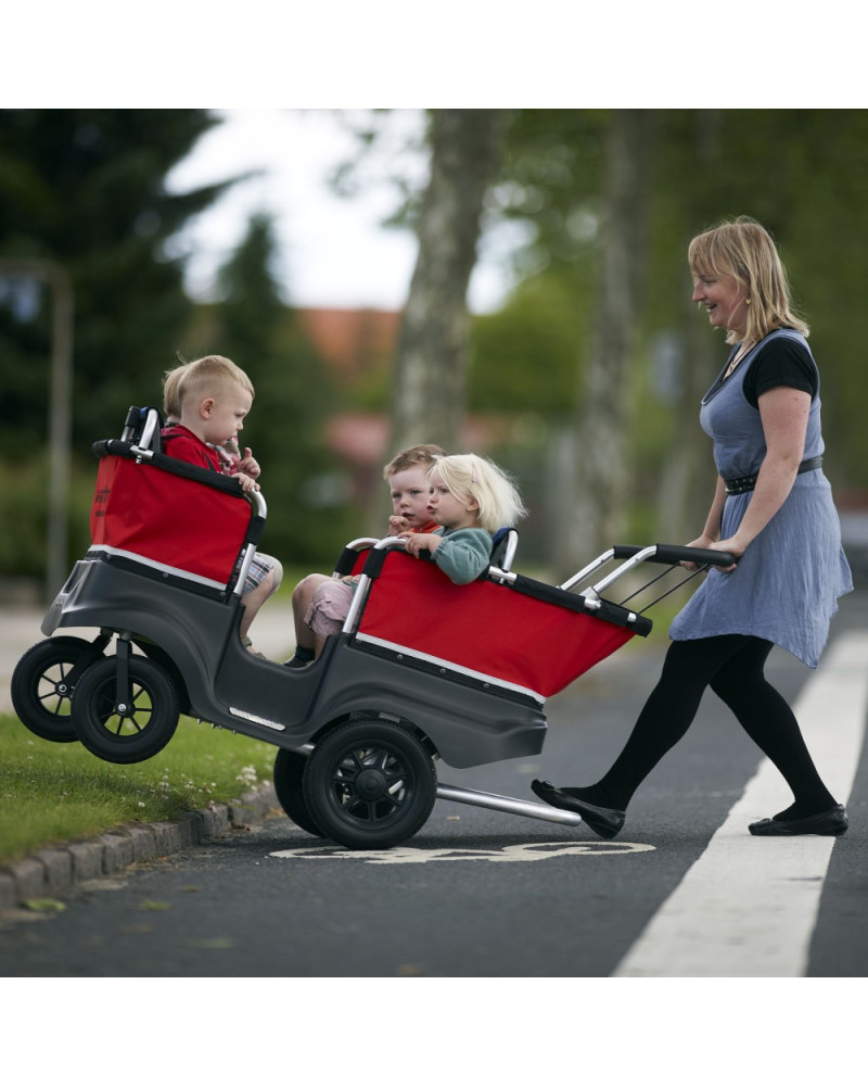DESCRIZIONE: Questo passeggino trasporta fino a 4 bambini da 6 mesi a 4 anni ( fino ad un max di 15 kg) ( fino ad un max di 15 kg) ed è ideale in caso di evacuazioni, situazioni di sicurezza e antincendio (ai sensi del D.L. 16 luglio 2014 “Regola tecnica di prevenzione incendi per la progettazione, costruzione ed esercizio degli asili nido”). Realizzato in polietilene resistente agli U.V e alluminio che lo rendono leggero e facile da manovrare. Ruote in gomma, Dotato di cinture di sicurezza e guida per manovrarlo. Cinture e sedili estraibili e lavabili a 30°. Fornito montato. Età 6m/4anni